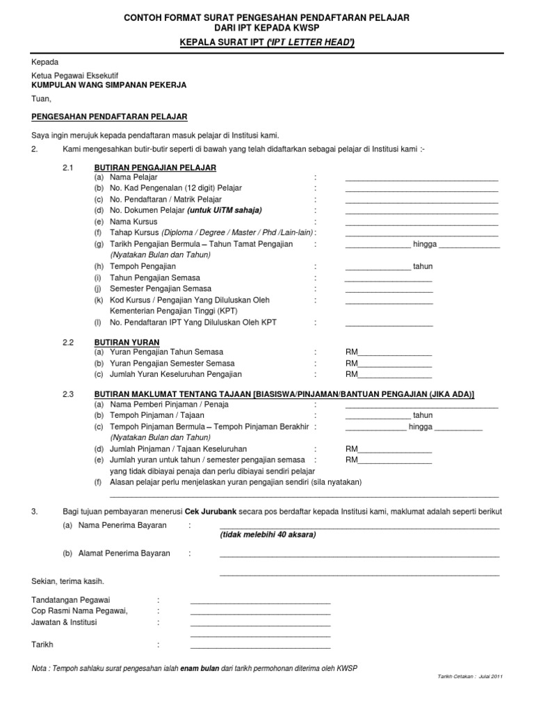 Contoh format surat pengesahan pendaftaran pelajar dari ipt kepada kwsp kepala surat ipt ipt letter head kepada ketua. Contoh surat rasmi kepada kwsp contoh sit cute766. Contoh surat salah caruman kwsp.