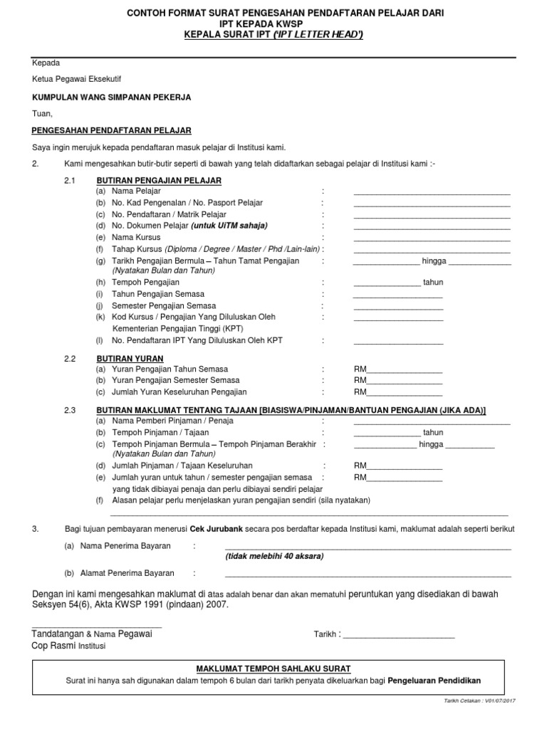 Contoh format surat pengesahan pendaftaran pelajar dari ipt kepada kwsp. Kepala surat ipt ipt letter head. 31032022 bagi memudahkan pencarum kwsp membuat permohonan pengeluaran khas kwspkami akan.
