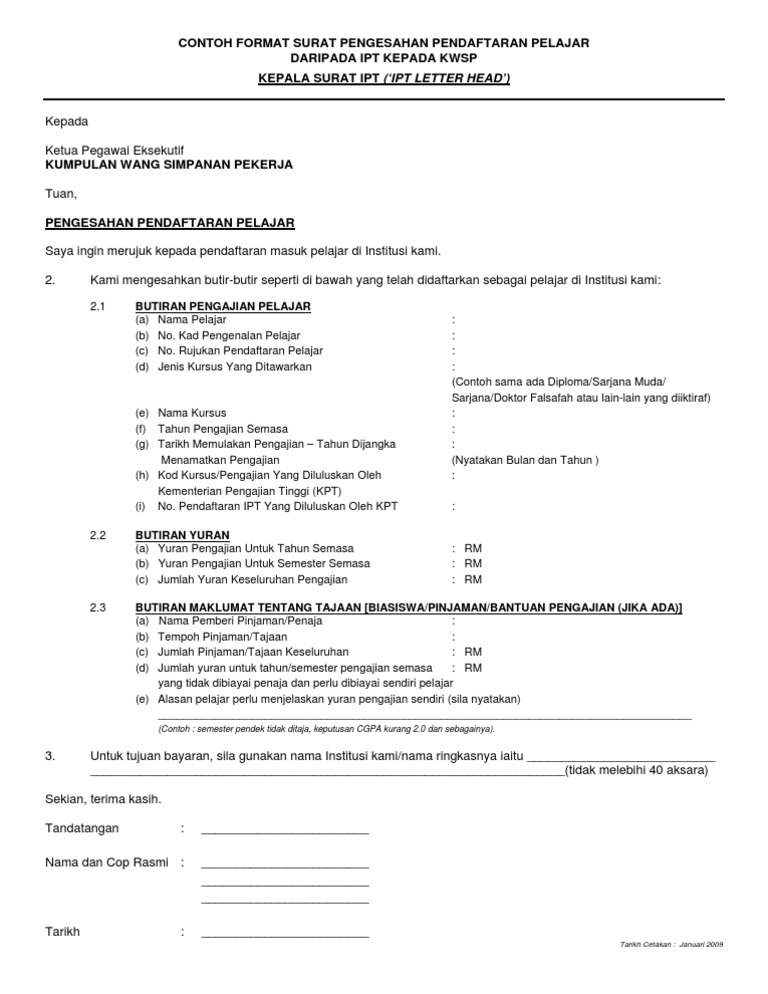 Contoh format surat pengesahan pendaftaran pelajar dari ipt kepada kwsp kepala surat ipt ipt letter head kepada ketua pegawai eksekutif kumpulan wang simpanan pekerja tuan. Contoh format surat pengesahan pendaftaran pelajar dari ipt. KEPALA SURAT IPT LETTER HEAD Kepada Ketua Pegawai Eksekutif KUMPULAN WANG SIMPANAN PEKERJA Tuan PENGESAHAN PENDAFTARAN PELAJAR Saya ingin merujuk.